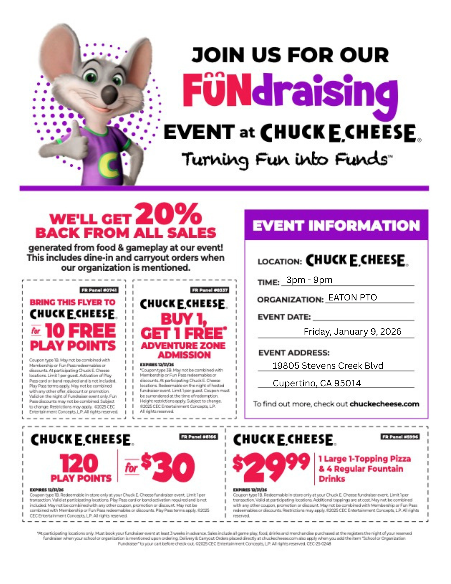 Join us at Chuck E. Cheese Cupertino on Friday, January 9! Stop by anytime between 3pm - 9pm. 20% of all sales are donated back to the Eaton PTO. Don’t forget to mention “Eaton PTO” or show this flyer when ordering!
